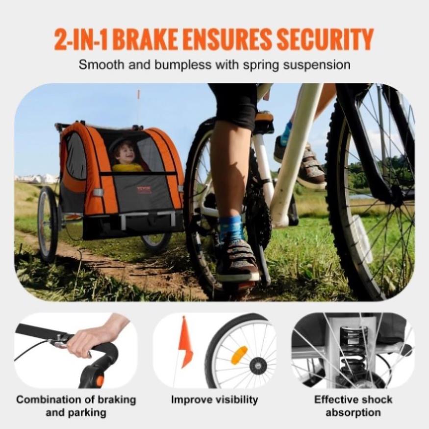 Our bicycle trailer ensures all-around protection with its hub spring suspension design, effectively absorbing shocks. With the 2-in-1 security handbrake, you can smoothly decelerate and park securely. Plus, bright reflectors make sure you're seen during the ride, adding an extra layer of security.