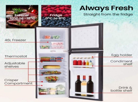 The 46L freezer compartment features a sturdy wire shelf, providing ample room for frozen essentials. The 96L fridge section includes adjustable steel wire shelving, a spacious crisper, and a convenient door layout with a bottle shelf, condiment shelf, and dedicated egg holder.