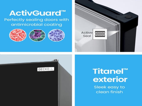 The Gecko Camping Fridge Freezer is designed to perform in harsh Australian conditions with quality compressor technology and thick insulation for fast cooling and operation in ambient temperatures of up to 38 degrees! The Gecko range features ActivSealTM technology, which consists of perfectly sealing doors with an anti-microbial coating to inhibit the growth of germs. The Gecko has flush, recessed handles, a great feature for confined spaces. All this is wrapped in a sleek TitanelTM metal finish, ensuring it will look right at home, anywhere!