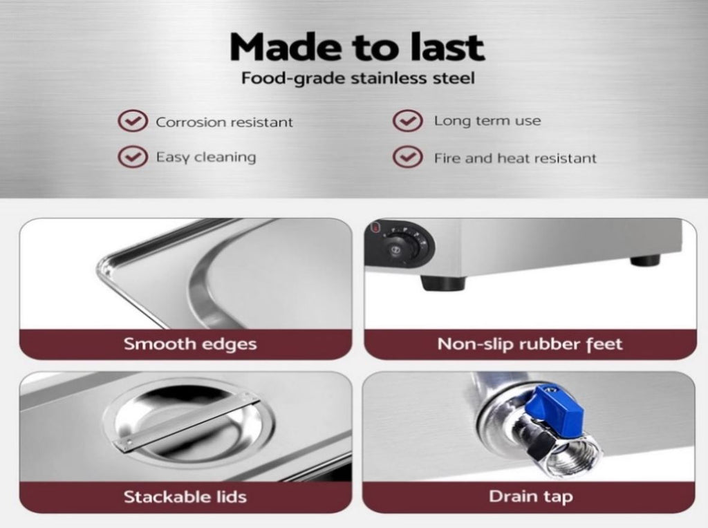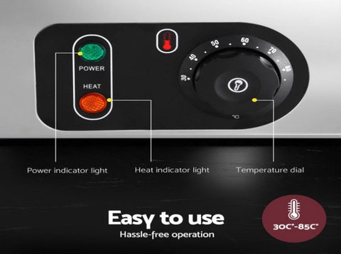 Keep food warm and ready to serve with this professional stainless steel food warmer. It features 4 removable food-grade pans, U-shaped heating for even heat, and an adjustable thermostat (30C-85C). The removable water bath ensures easy cleaning. Designed with non-slip feet, overheating protection, and an SAA-certified plug, it's safe and reliable. A perfect choice for buffets, events, restaurants, or home kitchens.