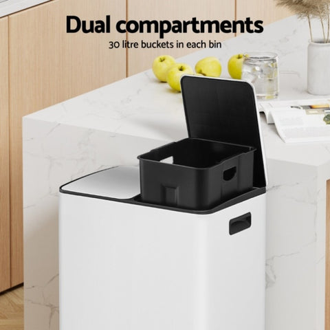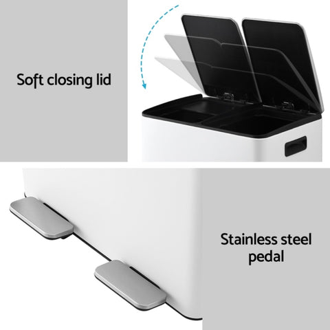 Cefito Pedal Bins Rubbish Bin Dual Compartment Waste Recycle Dustbins 60L White RB-60L-2C-WH