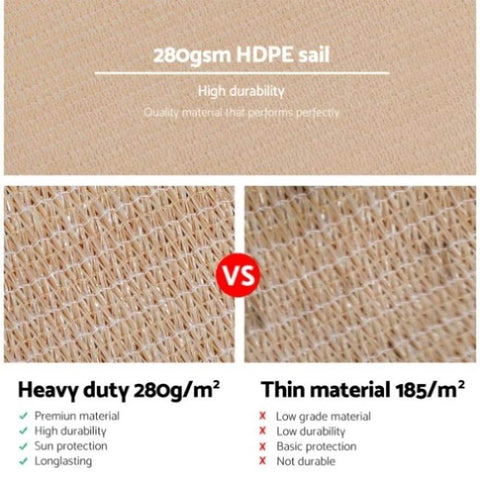 Instahut Shade Sail 5x5m Square 280GSM 98% Sand Shade Cloth SAIL-H-5X5-C-SA
