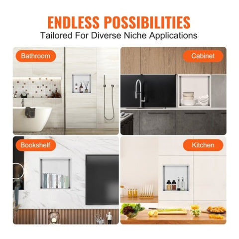 VEVOR shower niche utilizes X-line precision machine bending and full welding sealing, resulting in a seamless surface with a 100% seal waterproofing. This not only protects the walls from moisture and humidity, extending their lifespan but also effectively prevents moisture from penetrating into the wall, keeping the interior dry and hygienic.