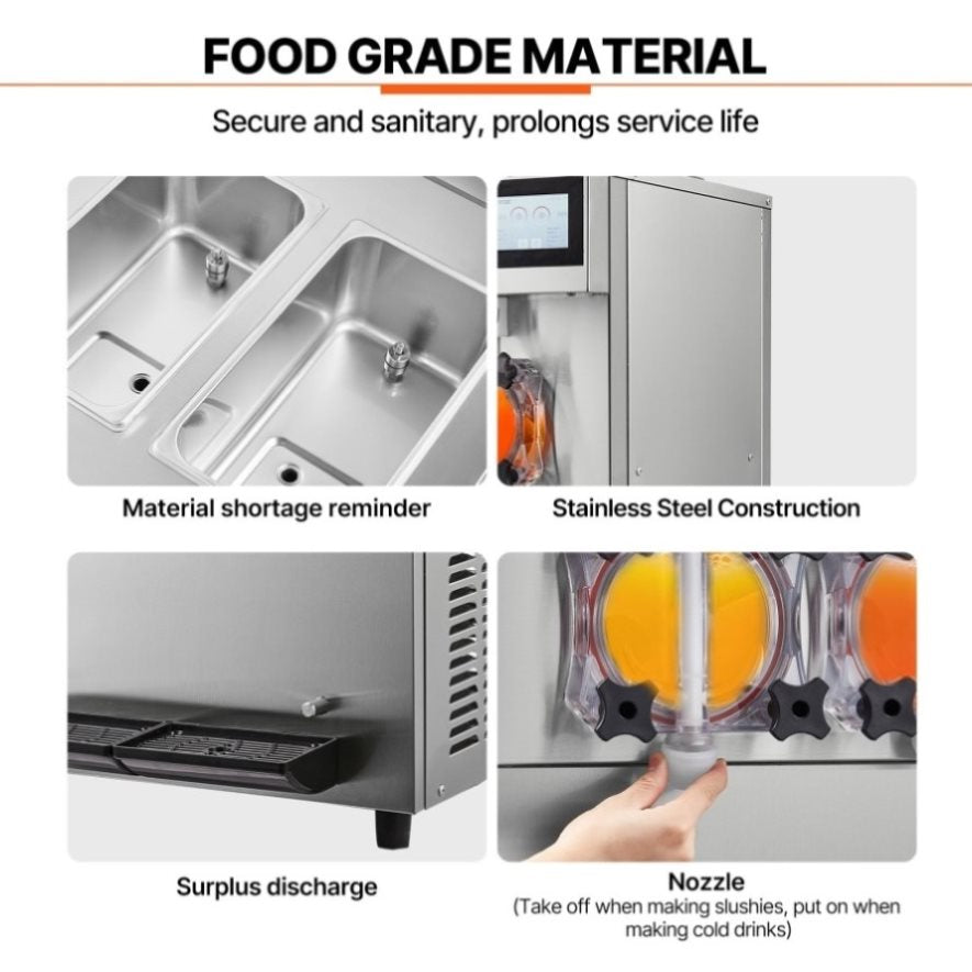 The entire slushy machine is made of high-quality stainless steel, which has excellent corrosion and rust resistance, withstand high pressure and is easy to clean. The ingredient tank and cooling tank are specially made with food-grade 304 stainless steel material. There is a small hole in the body for discharging the remaining ingredients to avoid clogging.