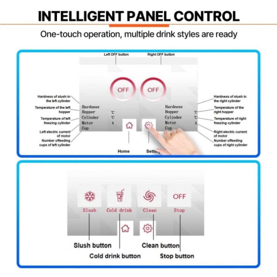 This slushie machine is equipped with an easy-to-operate panel. Adjusting the thickness according to your needs has never been easier. The simple one-touch operation allows serving your favorite frozen drinks. There are also thoughtful settings for one-touch cleaning, fault diagnosis, and power failure memory.