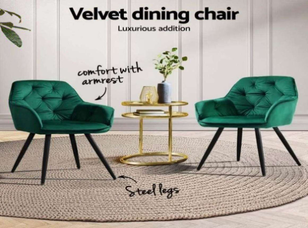 Wine, dine, and entertain guests with our meticulously designed Artiss dining chairs. They make a luxurious addition to any dining space and will make your guests envious of your gorgeous dining ambience. Not just for your dining room, these dining chairs are sure to make a statement in your study room, living room, and dressing room. Their versatility and ultra-modern design make them stand out. Incredibly stylish and sophisticated, our Artiss dining chairs feature inner solid wood construction with plush velvet upholstery that ensures lasting quality. It comes with solid steel legs with an anti-slip feet pad for ultimate stability and keeping your floors scratch-free. The dining chairs flaunt plush seats made with high-resilience foam that offer incredible comfort and support, and the cushioned back support with comfortable armrests allow you to dine with great comfort. Our dining chairs can hold up to 150kg weight, and their reinforced steel fixings make them super stable and reliable. Our Artiss dining chairs are certainly a big bang for your buck. Bring home this luxurious set of dining chairs without any hesitation.This product comes with one year warranty. *Note: The actual colours may vary due to differences in monitor colour depth and make.