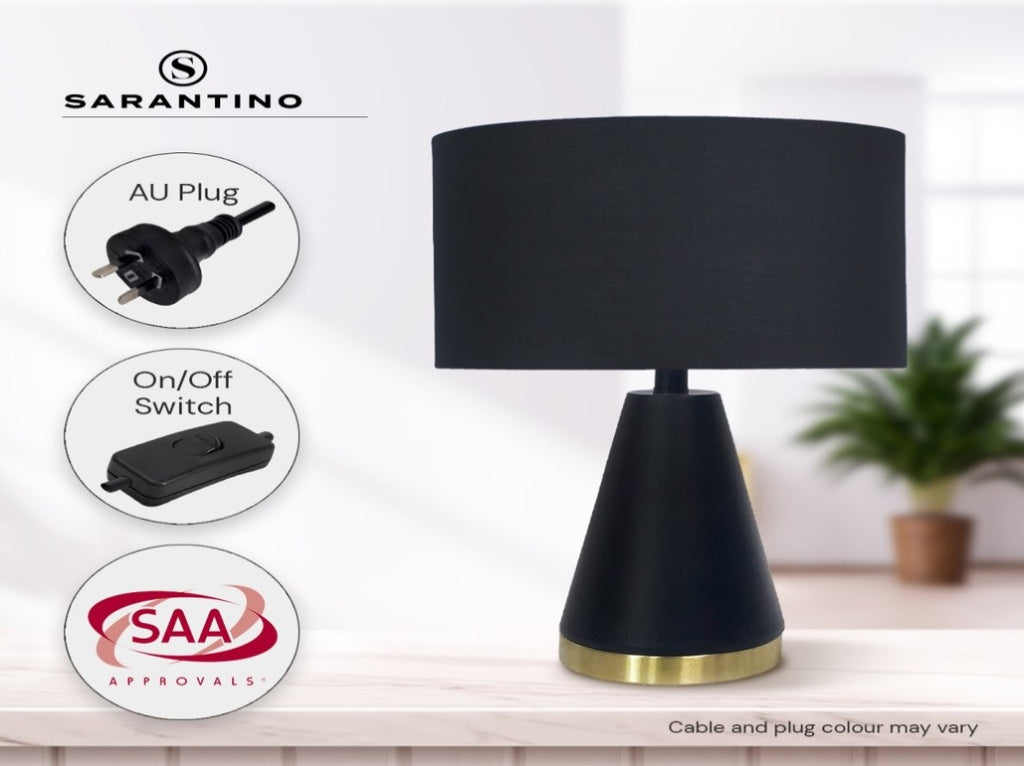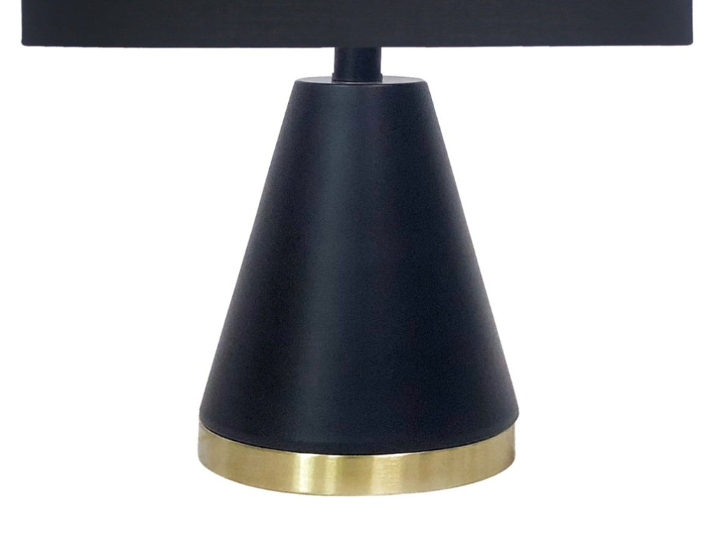 This table lamp, featuring a black and gold tapered metal base, securely stands on any surface or tabletop. It is a luxurious and elegant decor piece that will complement your space while adding illumination. The ingeniously crafted metal base is complemented by the black fabric shade. The glossy and sleek exterior brings out the best of your bedside, bedroom, living room, office, reading room, hotel or office