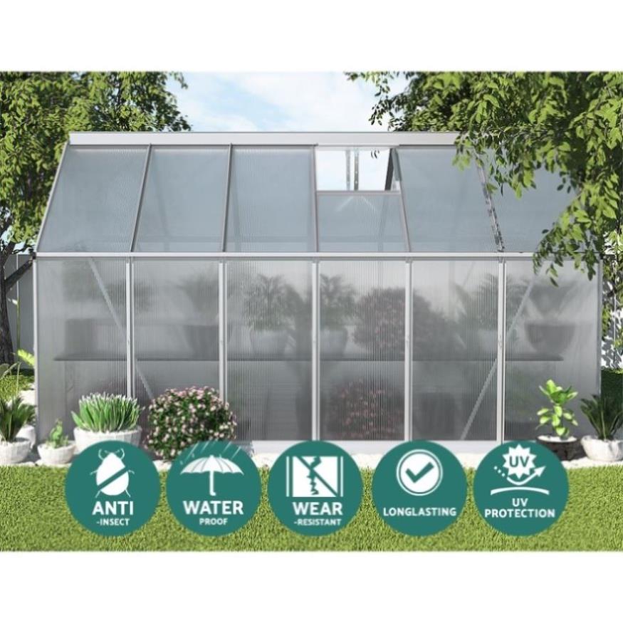 This spacious greenhouse has a massive volume of 17.64m and can accommodate a considerable number of plants and vegetables. Covered with twin-wall UV-resistant polycarbonate panels, the Green house allows up to 90% light transmission and helps to eliminate the risk of plant burn effectively. It also has a unique triangular Aluminium framework for enhanced durability and stability, two adjustable roof vents for good air flow and moisture and not least, an effective gutter system for smooth drainage.