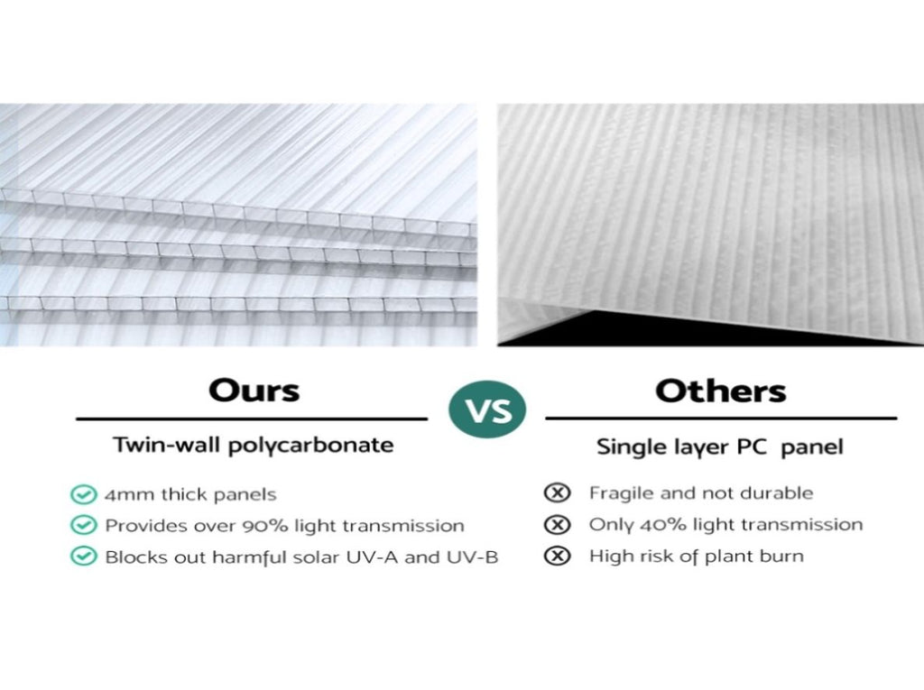 With 14.72 cubic meters of space and double-layer UV-resistant polycarbonate panels, it allows 90% sunlight penetration while protecting against burn.
