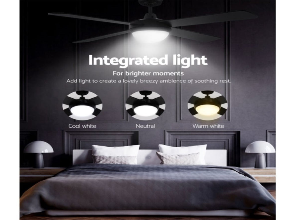 Gentle breezes, light drafts or high winds, the Devanti 52" Ceiling Fan is ever ready to meet your requirements easily. With six fan speeds, the contemporary-design ceiling fan also has a reverse cycle motor that can create downdrafts during summer or updrafts during winter for greater comfort. Its four high-quality wooden blades are pitched at an airflow-inducing 12 degree for more effective wind creation. Plus, its energy-efficient 35W motor operates ever so quietly. Also featured is built-in memory-enabled LED lighting that can bring on a cool white, warm white or neutral lighting ambience to go with the fanning function. Better still, the fan can be set for up to 8 hours of timed operation and the handy remote control makes this fan a breeze to use from anywhere in the room. The ceiling fan also comes with all the accessories for an easy installation including an extension rod. Available in black, white or silver colour to match your decoration easily.