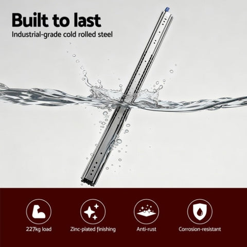 The Giantz Heavy Duty Drawer Slides come as a pair, measuring 76mm in width and 19.5mm in thickness, with a full extension range from 914mm to 1829mm. The three-section ball bearing design ensures smooth and quiet sliding.The secure lock-in and lock-out mechanism keeps drawers safely fixed in the fully closed or fully extended position, preventing accidental overextension or detachment from the tracks. Crafted from robust cold rolled steel with a corrosion-resistant zinc plated finish, these slides support up to 227kg load capacity, providing reliable strength for heavy storage.Ideal for large drawers, cabinets, industrial storage, vehicle fit-outs, and multimedia equipment, these slides are versatile and built to last. Each set includes two slides, 12 x M5 screws, and 12 x M5 screw nuts as a bonus for easy installation.