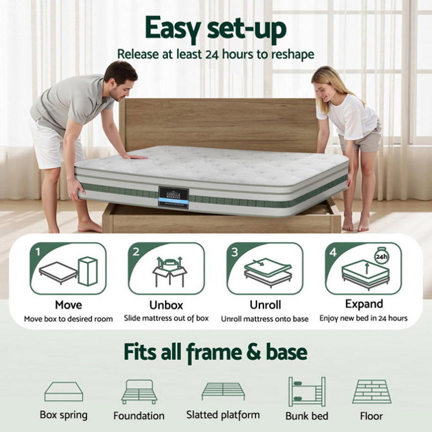 The Giselle Bedding Mint Series Mattress combines natural freshness with responsive support. Green tea foam helps maintain a fresher sleep environment, while the Euro Top layer cushions pressure points. Its 20cm profile features high-compression pocket springs and 6-turn coils that adapt to your body shape without losing firmness. Reinforced edges provide stable sleeping space, and the breathable bamboo fabric cover promotes airflow for temperature control. Available in 5 sizes (Single to King), it's engineered for lasting comfort in warm climates.