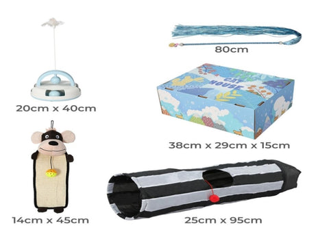 Jump, rest, and play. Almost no assembly before your cat can bat around their self-play cat wand toy. Your cat can scratch their funky monkey scratch pad. Or perhaps roam through their cat tunnel.
