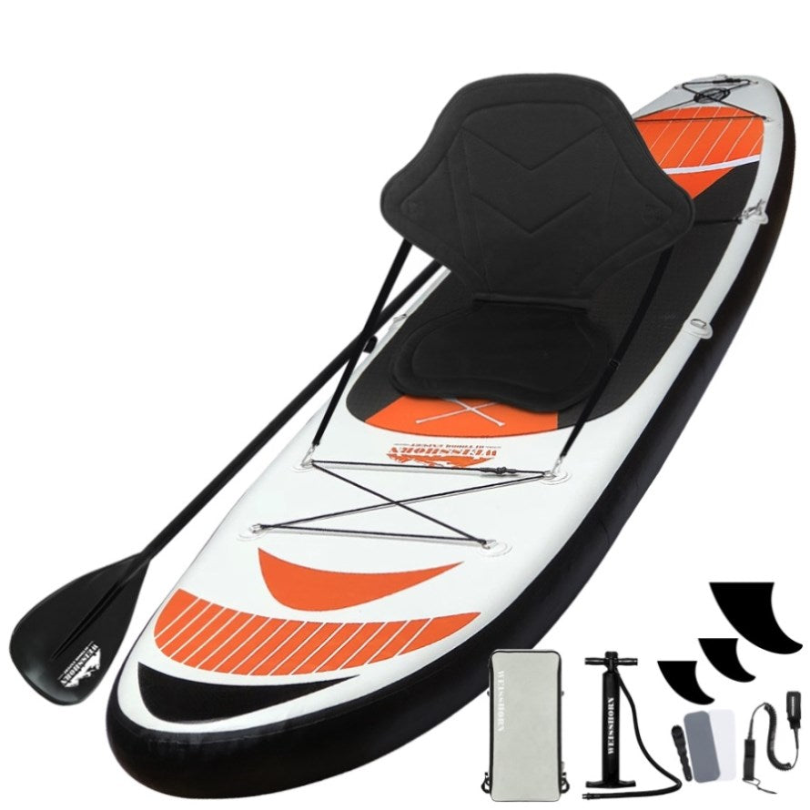 Our Weisshorn Stand-up Paddle Board is designed to suit the beginner paddler as well as a seasoned and easily fits both paddler and passenger for hours of maximum enjoyment. Better still, it is made from durable drop-stitch core material and easy to inflate and deflate, with similar build qualities that you will find with its pricier fibreglass counterparts. It maintains rigidity and toughness with a thickness of 15cm and has a weight capacity of up to 185kg. The supplied 1.7m adjustable aluminium paddle is highly versatile in both paddling and steering while the three fins underneath the board ensure steady gliding, easy manoeuvrability and smooth turning. In fact, one of the fins is removable to give better directional stability. Getting your aquatic escapades started with the paddle board is a simple task of inflating it with the included pump and you are good to row. And because it can be packed away into its handy travel bag, you can take the paddle board just about anywhere you want to go for your water adventures. Also included is a repair kit and a quality adjustable kayak seat that can turn your paddle board into a kayak to enhance your comfort. The kayak seat also comes with a storage pocket where you can conveniently place your personal belongings.