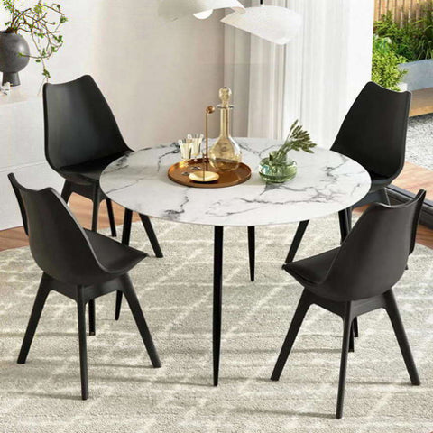 Everyone needs a dining table, and there's no dining table like an Artiss Marble Dining table. The table is an affordable alternative to real marble, made from particle board with a marble finish and sturdy metal legs without sacrificing elegance. Simple and modern, the table instantly makes a statement in your dining room with its minimalist appeal and sleek, sophisticated appearance. The round table features smooth edges for safety while the anti-rust, powder-coated steel legs are sturdy and durable with a weight capacity of up to 90kg. With its practical, industrial-style aesthetic, the dining table will suit most home and décor types and provides plenty of room for a family of four, whether it's dinner time, book club or board game night.