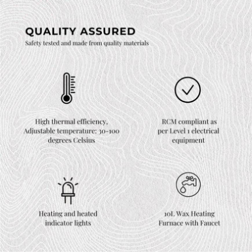 This wax melting furnace is an ideal addition to your candle making operation. With a 10L capacity and adjustable temperature gauge from 30-100 degrees celsius, it can be used to melt all kinds of candle making waxes such as soy, paraffin, bees, hard, beads, and more.