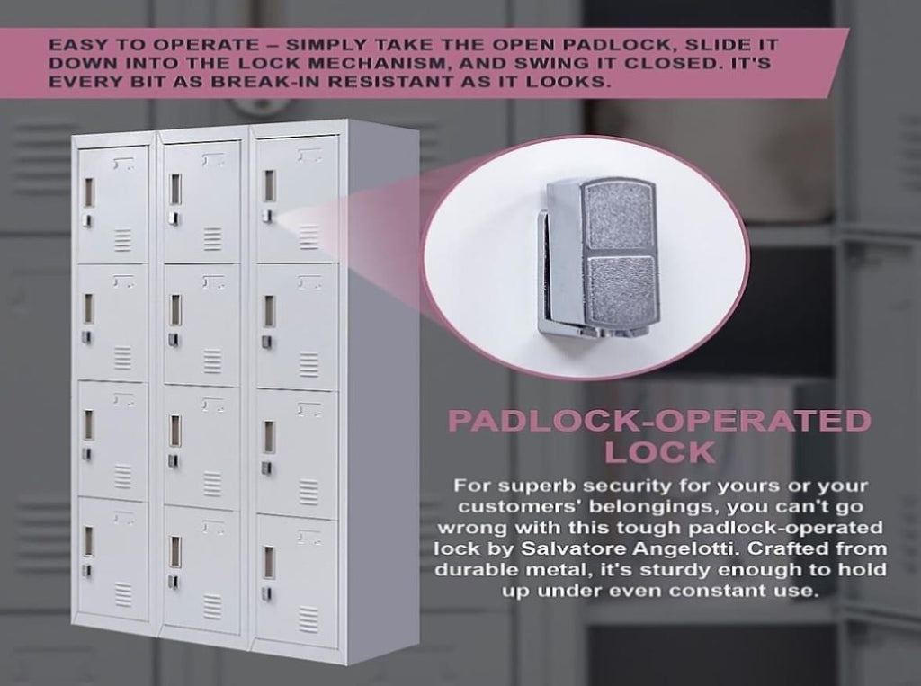 The unit has 12 individual locker compartments stacked in a 3 x 4 grid. Each locker provides ample space for personal items and can hold up to 30 kg. Built-in ventilations slits keep the stored items from smelling musty. Users may also customise their locker with a name tag or label in the designated slot provided. This comes comes with padlock-operated lock to ensure safety of your belongings.