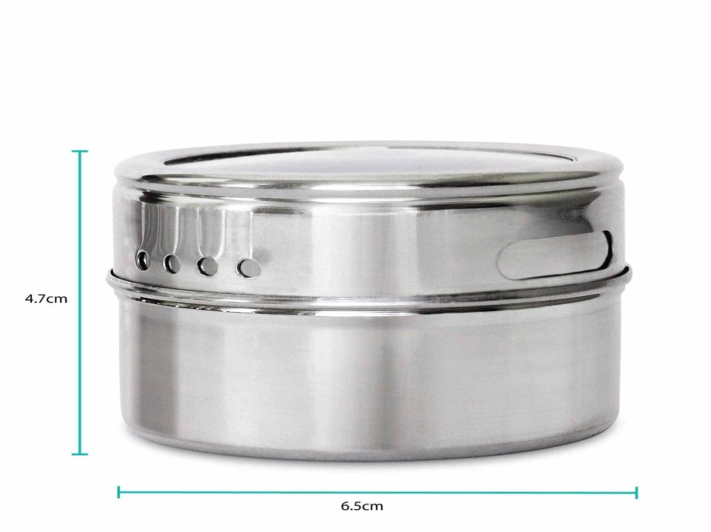 Spice up your cooking with this stainless steel spice jar rack set. The tins feature a shaker transparent lid and magnetic base, and come with a stainless steel plate, ready displayed on any kitchen benchtop. Fill the jars up with your favourite spices or teas for easy application and storage.