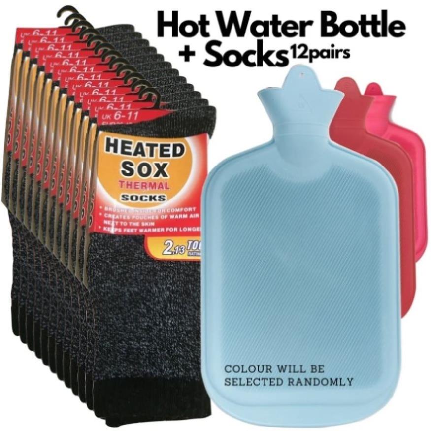 12 Pairs Thermal Heated Socks w/ BONUS Hot Water Bottle Warm Winter Pack V563-BOTTLESOCKSSET