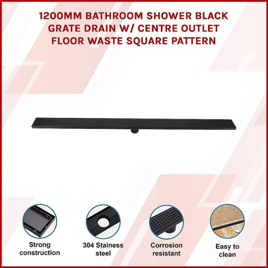 1200mm Bathroom Shower Black Grate Drain w/Centre outlet Floor Waste Square Pattern V63-832941