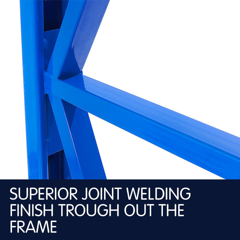 This heavy duty shelving system utilizes gusseted joints on the vertical triangulation beams rather than simple tack-welds. This ensures that system will remain sturdy and secure even after years of regular use in commercial or home applications.