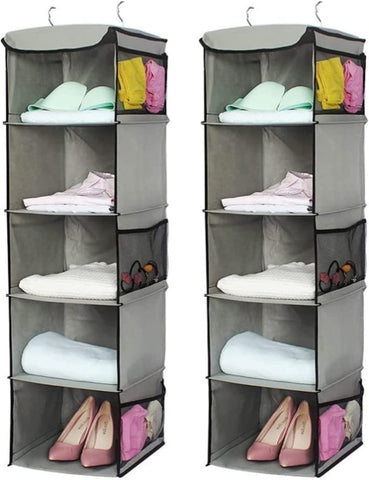 2 Pack 5 Foldable Shelf Hanging Closet Organizer Space Saver with Side Accessories Pockets for Clothes Storage