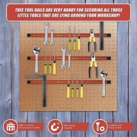 There are few things a productive worker likes more than an organized work area - and with this sturdy magnetic tool holder, it will save you space by making your tool area larger and saves your time looking for the right tools. This tool rails are very handy for securing all those little tools that are lying around your workshop!