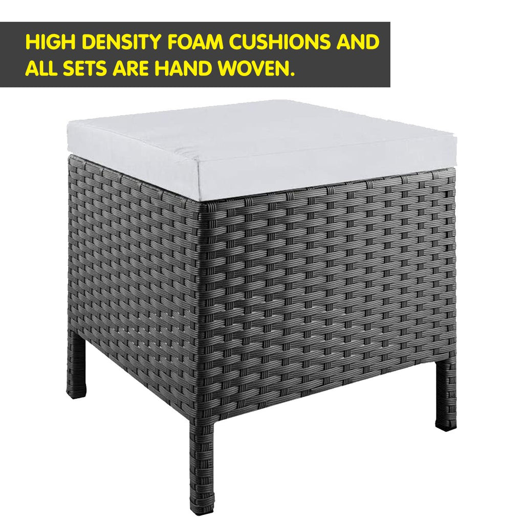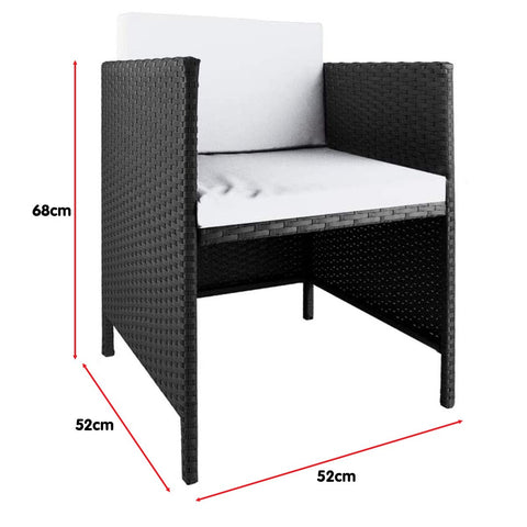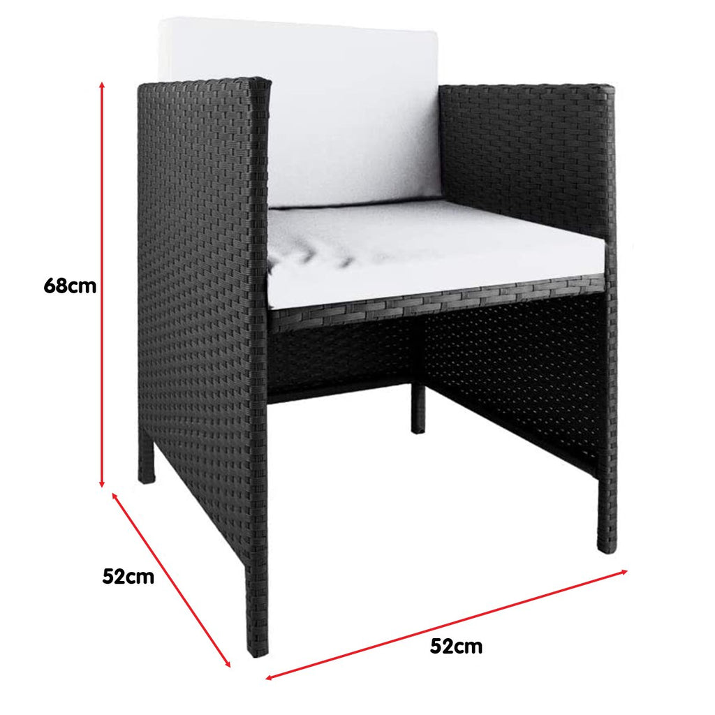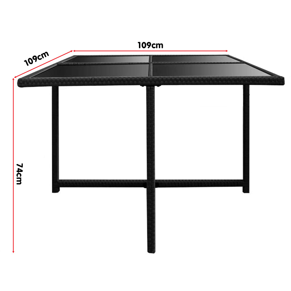 The black-and-white design is simply sophisticated - the perfect centrepiece for a chic outdoor space. This dining set comes with 4 chairs and 4 ottomans, which can be stored right under the table when not in use. Whether you want to enjoy an al fresco breakfast or you're hosting a dinner for all your friends, this outdoor furniture set provides a beautiful setting. After use, simply wipe the glass tabletop clean.