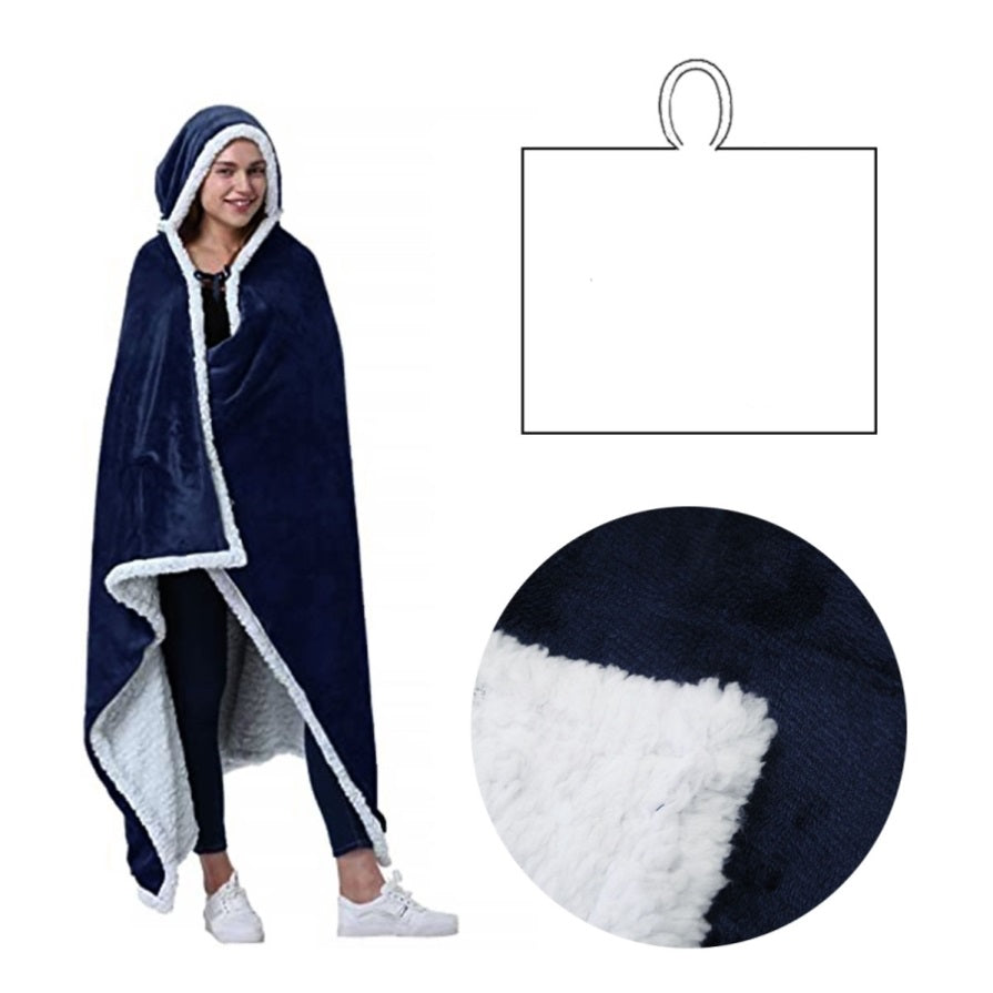 Adult Men Women Open Blanket Hoodie Poncho with Sherpa Fleece Reverse Navy V442-ABR-BLANKET-OPENHOODIEPLAIN-NAVY-SH