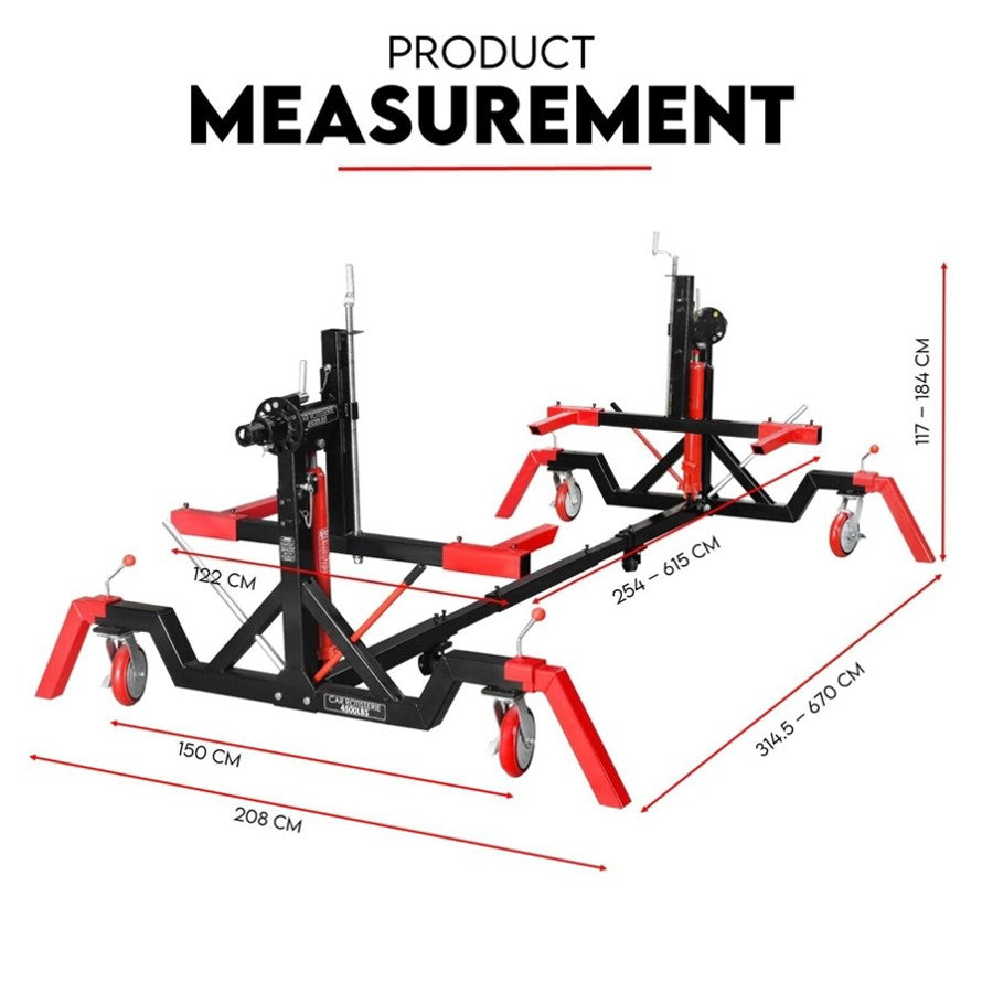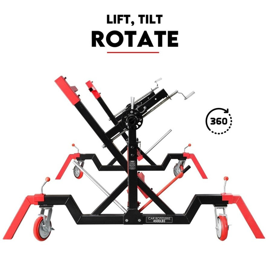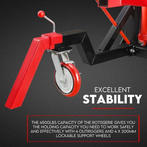 Fiernero Auto Rotisserie 4500LBS is perfect for body shops, gear drives, race car fabrication, and classic car restoration. It includes outriggers (4 stabilizer legs) and 4 locking casters to keep the rotisserie in place.