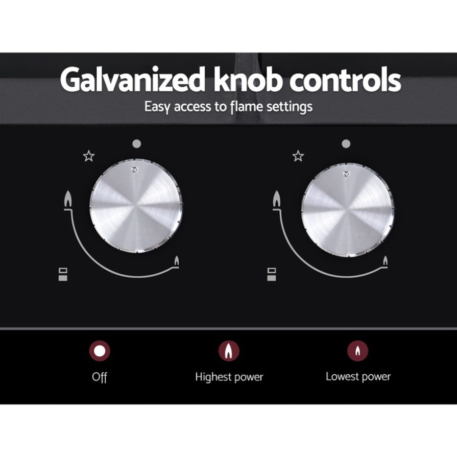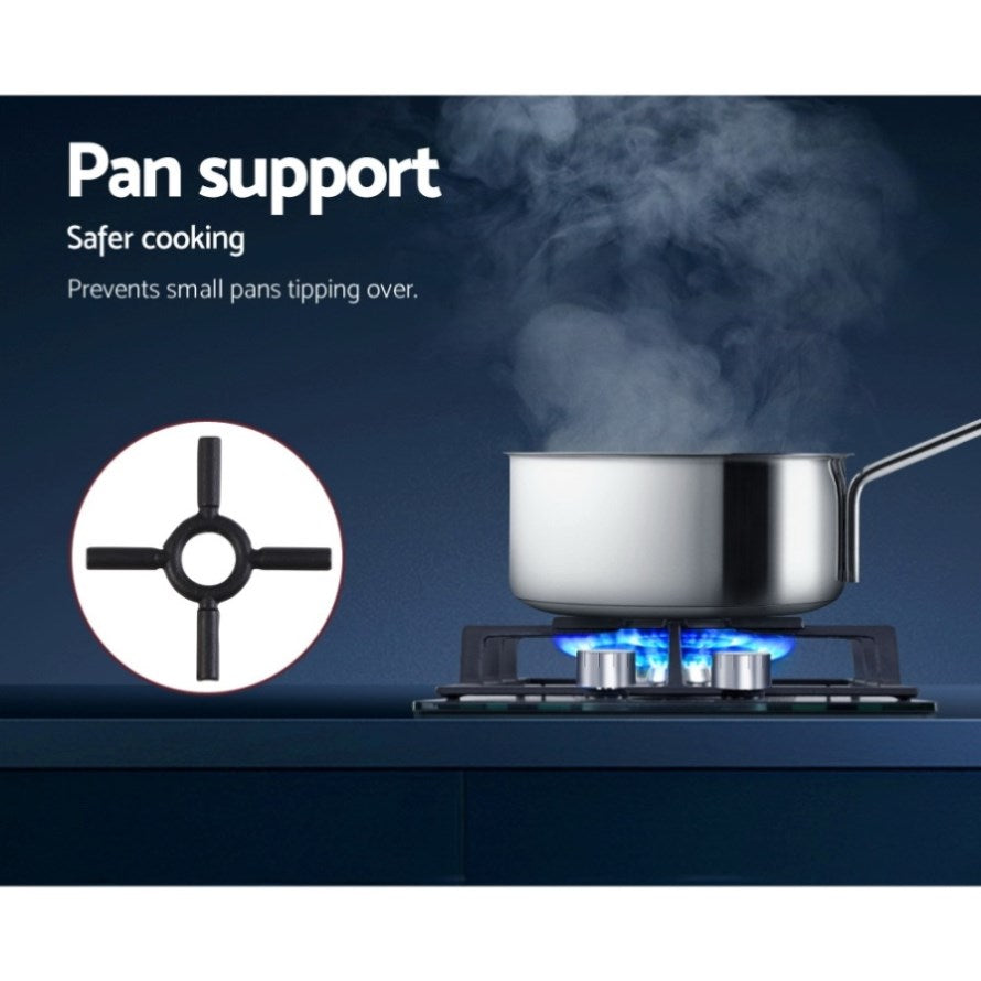 Whether it is for your existing or new home, our Devanti 30cm Gas Cooktop is just the right thing you need for easy, no-fuss cooking. Loaded with an extensive list of chef-friendly features such as an easy ignition system, easy-to-use galvanized knob control with a safety lock and flame failure safety device, the cooktop is also incredibly sleek with its black tempered glass surface. It features two burners, a wok burner and one auxiliary burner, with various power levels to choose from to prepare that perfect dish. The solid cast iron grates hold up your pots and pans perfectly steady and are longlasting and heat-resistant as well. And a pan support is included for use with the auxiliary burner to prevent tiny pans from tipping over and messing up your cooktop. The cooktop is factory set for natural gas but is compatible with LPG once the included LPG conversion kit is installed. Powerful and yet integrally safe, the cooktop promises many moments of hassle-free delicious cooking with the right blend of sophistication and class for your kitchen.