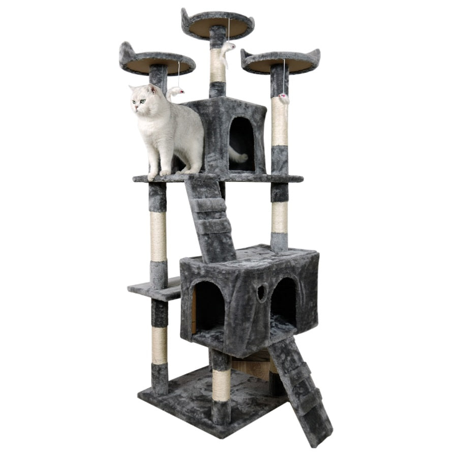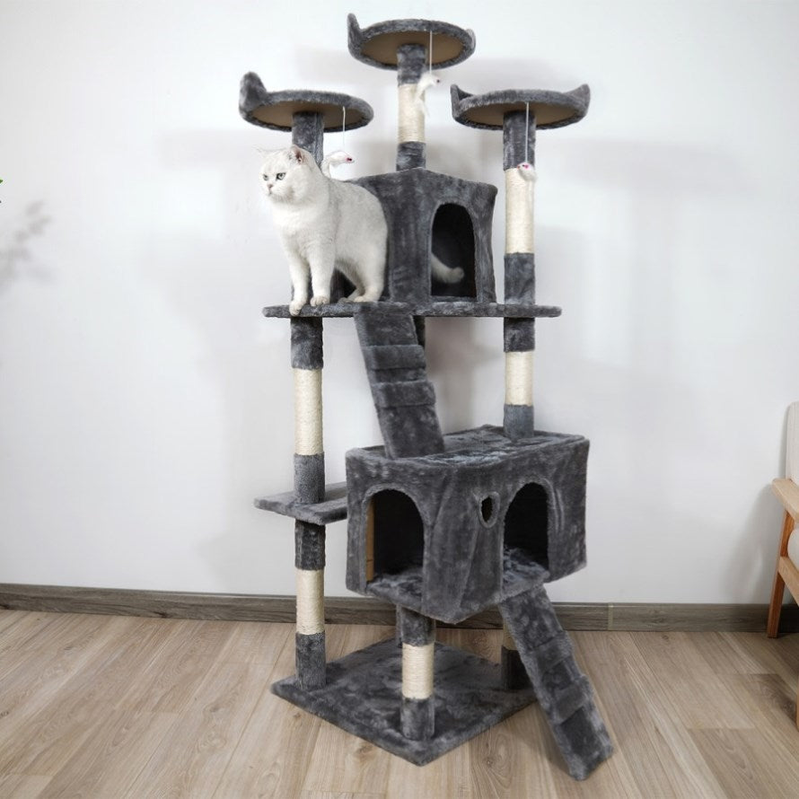 At 170cm tall, it features two cubby houses, two ramps and multiple shelves to perch, climb and nap on. The dangling toys right at the top provide a healthy outlet for your cats' hunting instincts. And the built-in scratching posts will let your cats sharpen their claws without damaging your rugs or furniture.