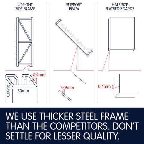 L-Shaped cross beams give you superior strength and durability for all loading purposes and provide a secure locating slot for the shelf panels. The beams are precisely engineered to dimensions that ensure the shelf panels slot in place at the right hight to give an even loading surface.