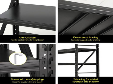 Conquer your storage woes with this ultra-durable Giantz Storage Rack! Built with industrial-strength steel and a reinforced frame, each shelf boasts a massive 200kg capacity, making it ideal for storing even the bulkiest items. Don't worry about wobbling or bending – Z-bracing provides additional stability, while adjustable shelf heights allow you to customise the configuration to perfectly fit your needs. To top it off, a rust-resistant coated finish ensures this rack looks sharp and protects it from wear and tear for years to come. This is the perfect storage solution for maximising space and organisation in your garage, workshop, basement, or any area needing a heavy-duty storage upgrade.
