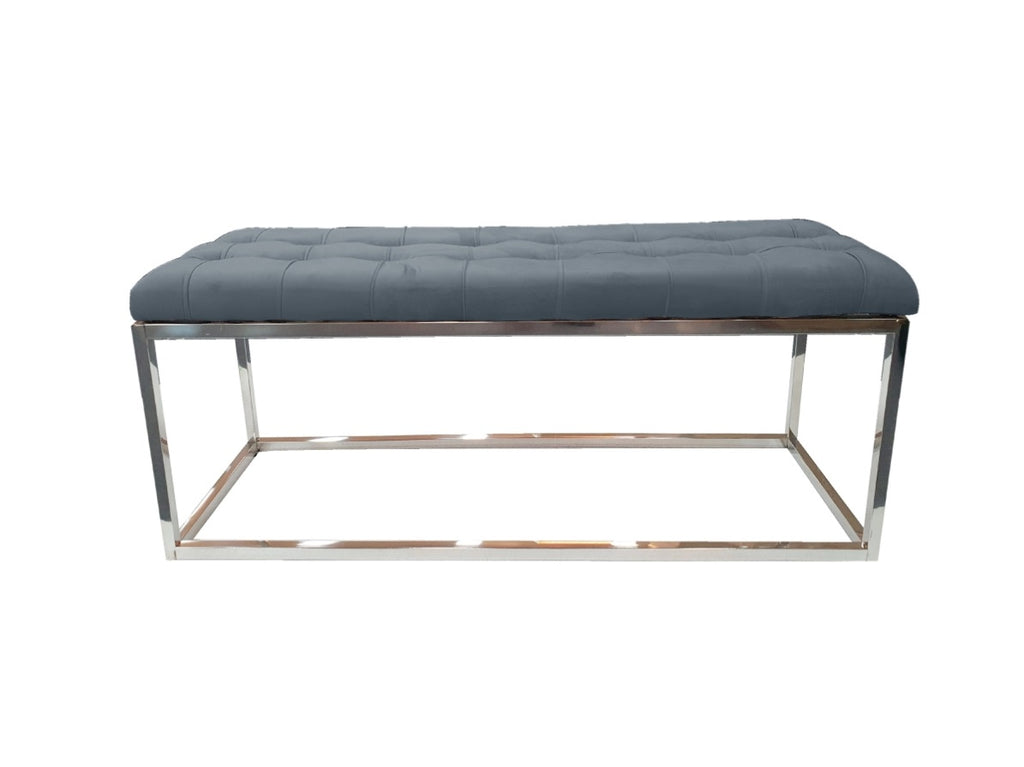 The ottoman is made from high-quality materials, including stainless steel with a silver finish and tufted velvet upholstery in dark grey The combination of these materials creates a sophisticated and modern look that will complement any decor style.