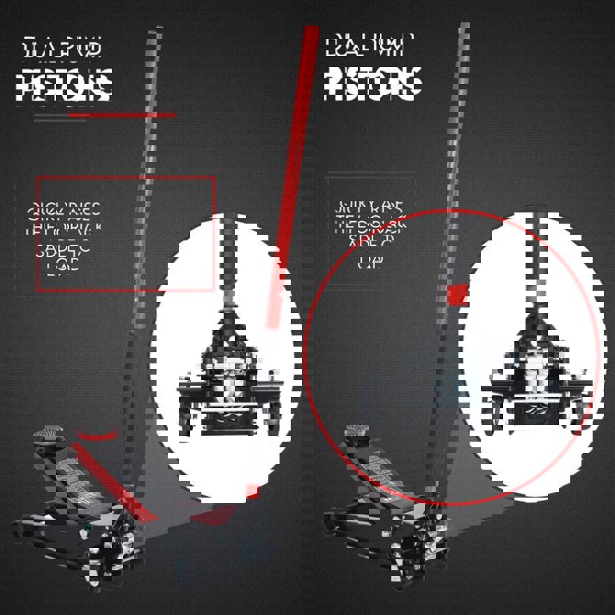 - DUAL PUMP PISTONS: Quickly raises the floor jack saddle to load