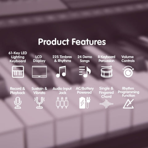 The LED lighting guide and optional key stickers make learning faster and easier, helping beginners master their skills quickly. With 255 timbres, 255 rhythms, 8 keyboard percussions and 24 demonstration songs, this keyboard offers a versatile range of sounds, perfect for practice and music creation.