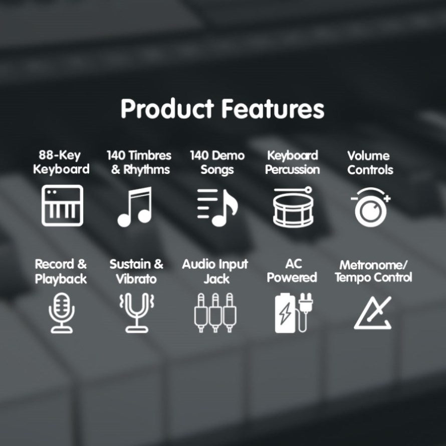 Whether you are a beginner looking for the ideal first keyboard, or an intermediate user seeking to sharpen your skill set, this Karrera 88-key electronic piano keyboard provides the perfect combination of professional-grade features and user-friendly design. Loaded with 140 Timbres, 6 voice direct election keyboard percussions, and 16 demonstration songs, this keyboard offers a full range of sounds to develop and hone your practice both quickly and easily.