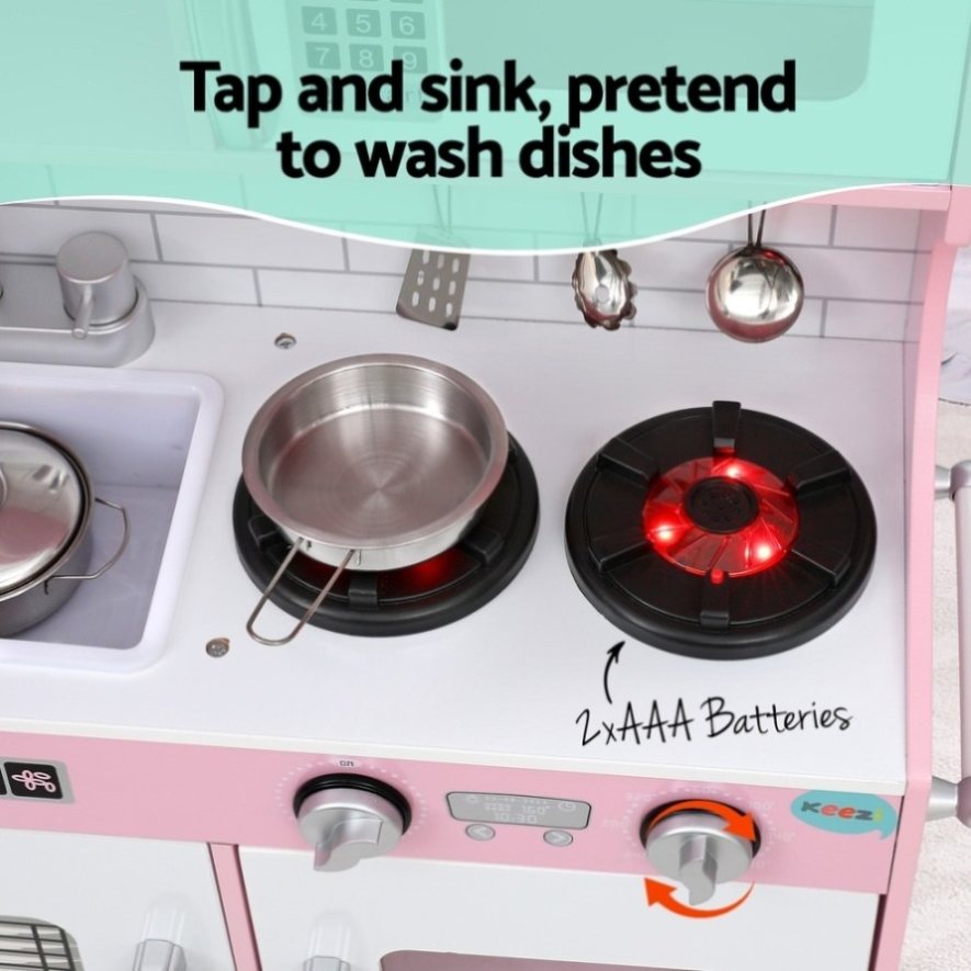Explore imaginative play with our Keezi Wooden Kitchen Play set. Crafted from sturdy MDF and solid wood with a non-toxic paint finish, it features a smooth surface for easy cleaning. Includes cooking accessories, a fully operational oven door, turnable oven knobs, and a telephone for orders.