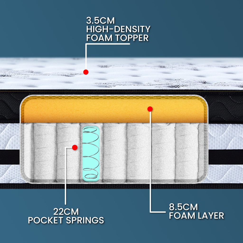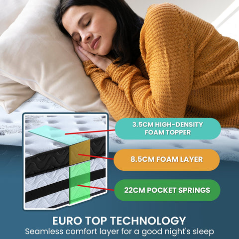 Pocket Springs follow the natural contours of your body for sublime comfort, reduces deformation and responds precisely to your every movement. Specifically zoned in 5 places to provide maximum support. It offers edge to edge support resulting in a larger sleep surface and ensuring this top quality mattress has a long life span.