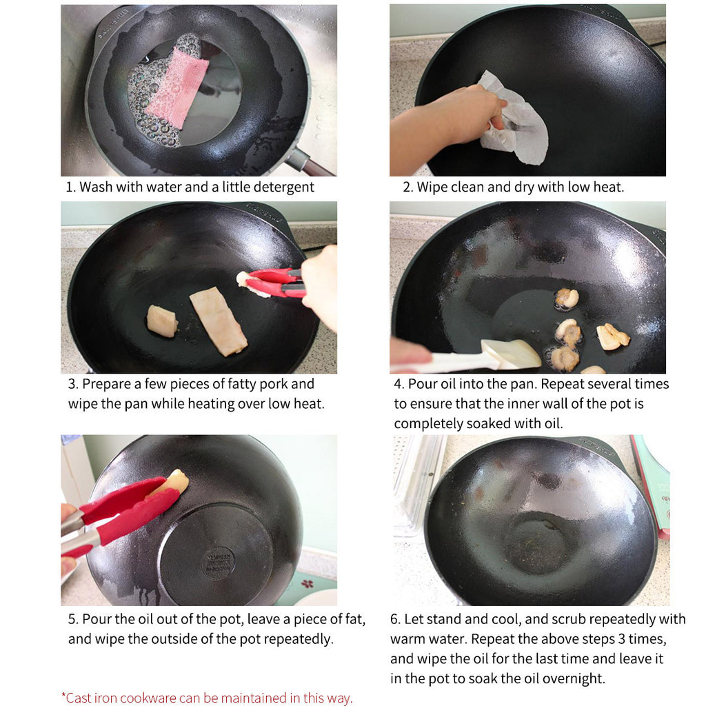 - Heat a pan on a burner slowly, first on low, then increase to higher settings. Avoid using metal utensils with sharp edges or corners. Avoid cooking acidic foods that may compromise your seasoning. Allow a pan to cool on its own to room temperature before cleaning