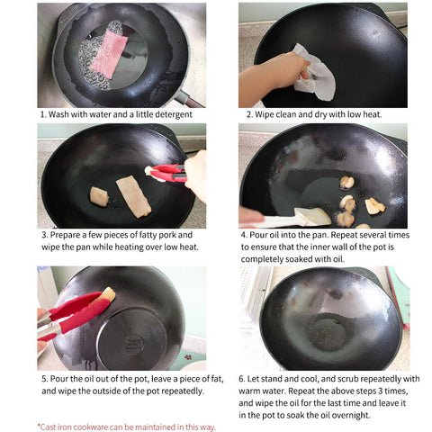 - Heat a pan on a burner slowly, first on low, then increase to higher settings. Avoid using metal utensils with sharp edges or corners. Avoid cooking acidic foods that may compromise your seasoning. Allow a pan to cool on its own to room temperature before cleaning