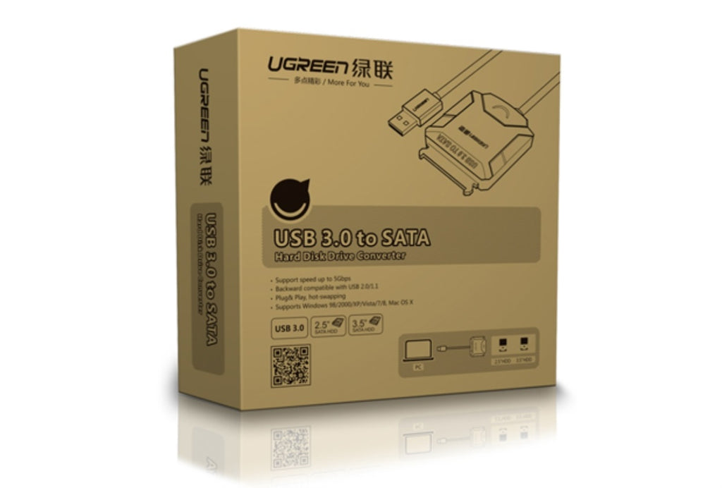 UGREEN 20231 USB 3.0 to SATA Converter Cable connects any standard 2.5 inch SATA Hard Drive or Solid State Drive (SSD), or any 3.5 inch SATA hard drive to a computer through USB 3.0 ports.It's a ideal for you to backup files or upgrade your notebook hard driver.