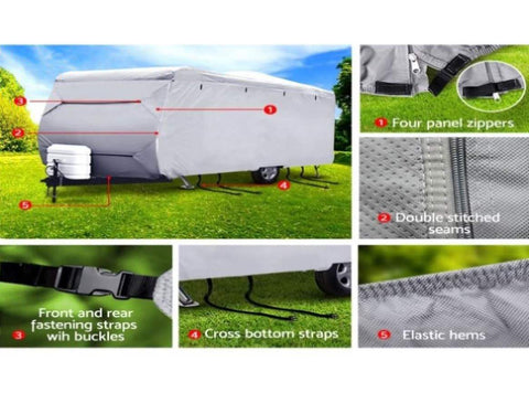 Putting on the cover is a breeze with the four sets of tie-down straps while the zipper door panels and openable four sides allow convenient access fast. The elastic hems, adjustable straps and buckles ensure a tight and secured fit. Not least, the tough interlocking seams make this caravan cover strong and sturdy in any weather condition.